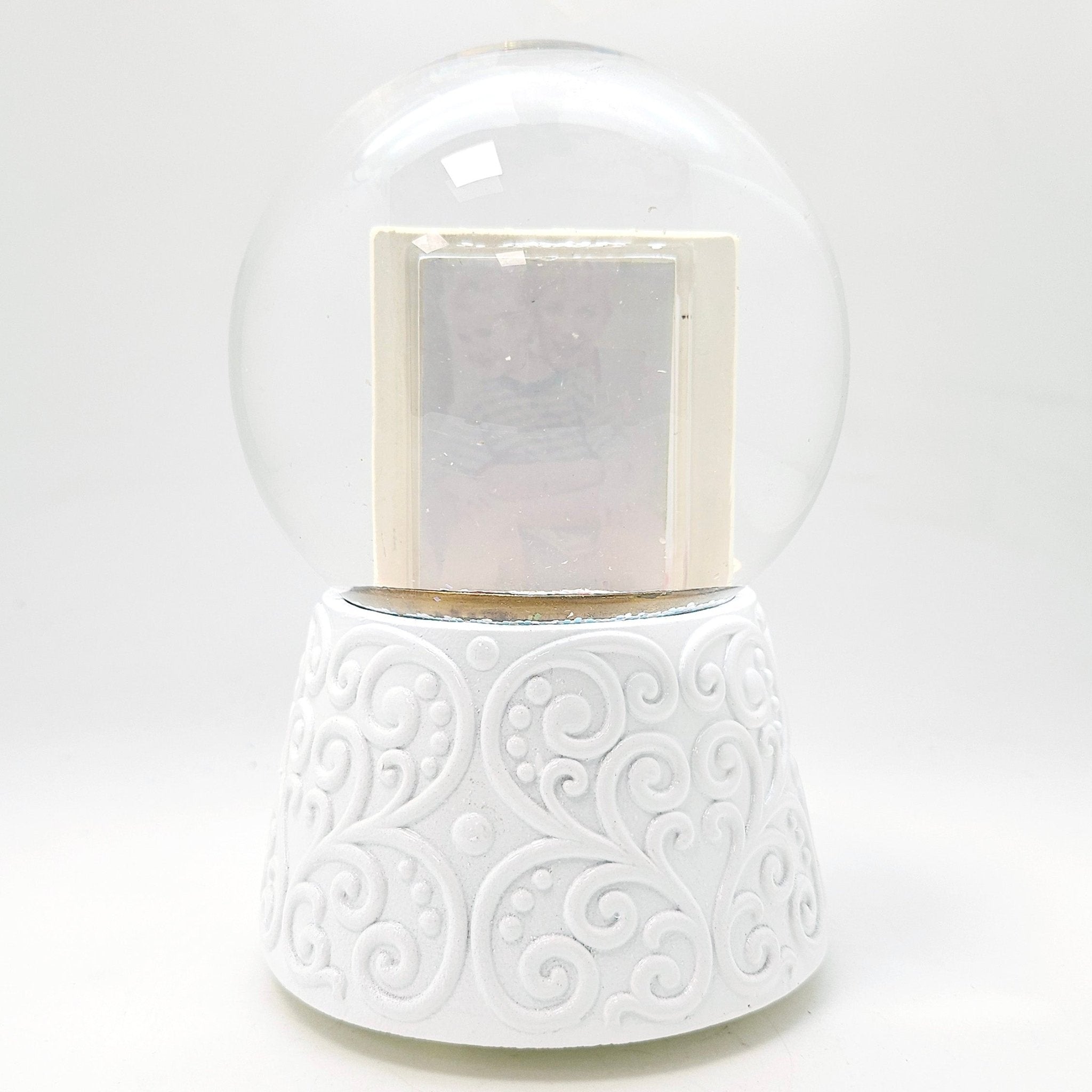 Met deze gepersonaliseerde sneeuwbollenset maak je een uniek aandenken. De set bestaat uit een glazen koepel met een geïntegreerd fotolijstje en een bijpassende basis. Het witte frame is versierd met een charmant boeket rozen, wat een elegant tintje toevoegt. Deze set is een perfect cadeau voor Valentijnsdag, Moederdag of een andere gelegenheid die je deelt met een speciaal persoon.