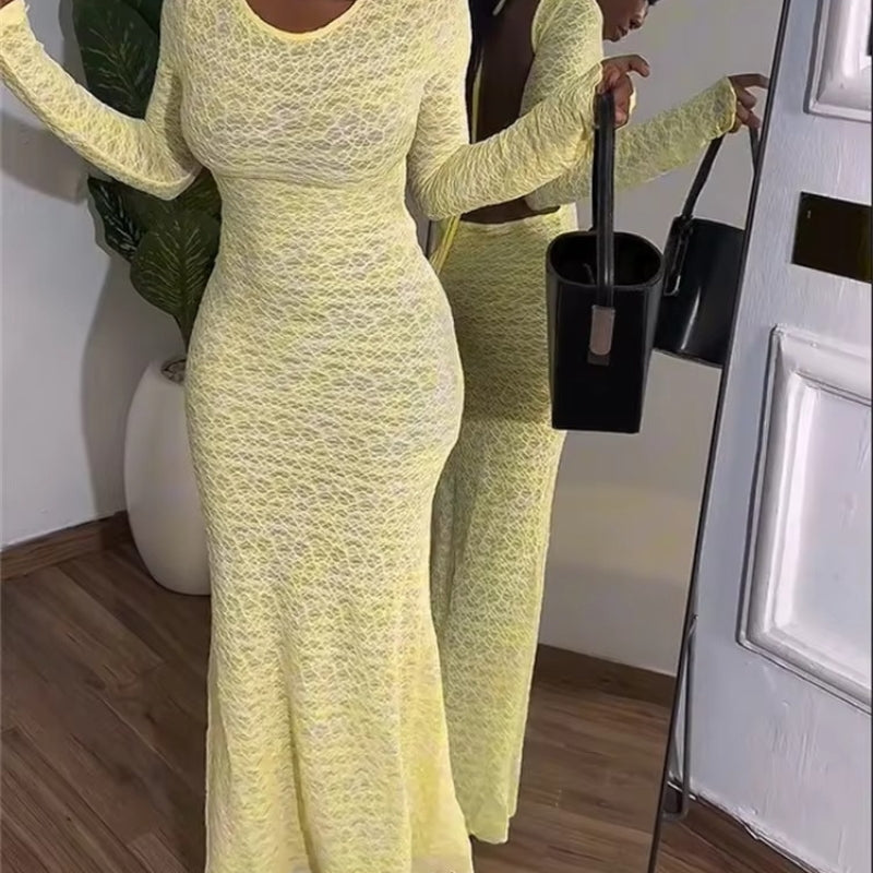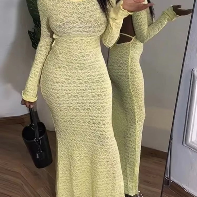 Lange Mouw Jurk met Ronde Hals, Slim Fit en Open Rug Ontwerp