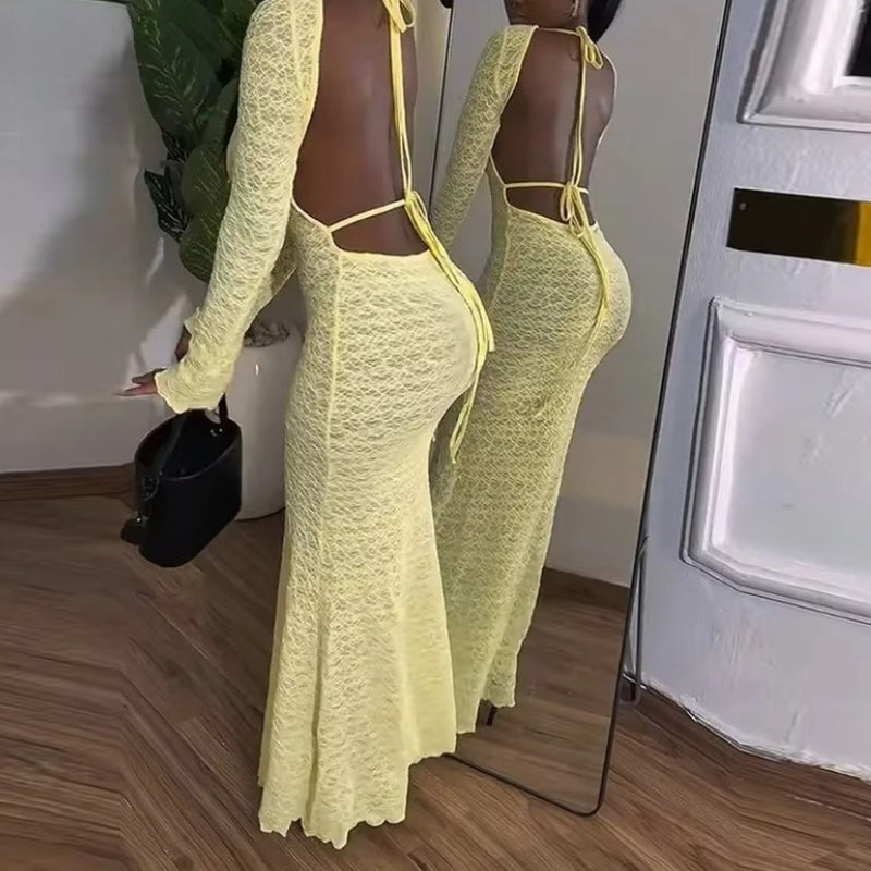Gabriella - Lange Mouw Jurk met Ronde Hals en Open Rug Ontwerp