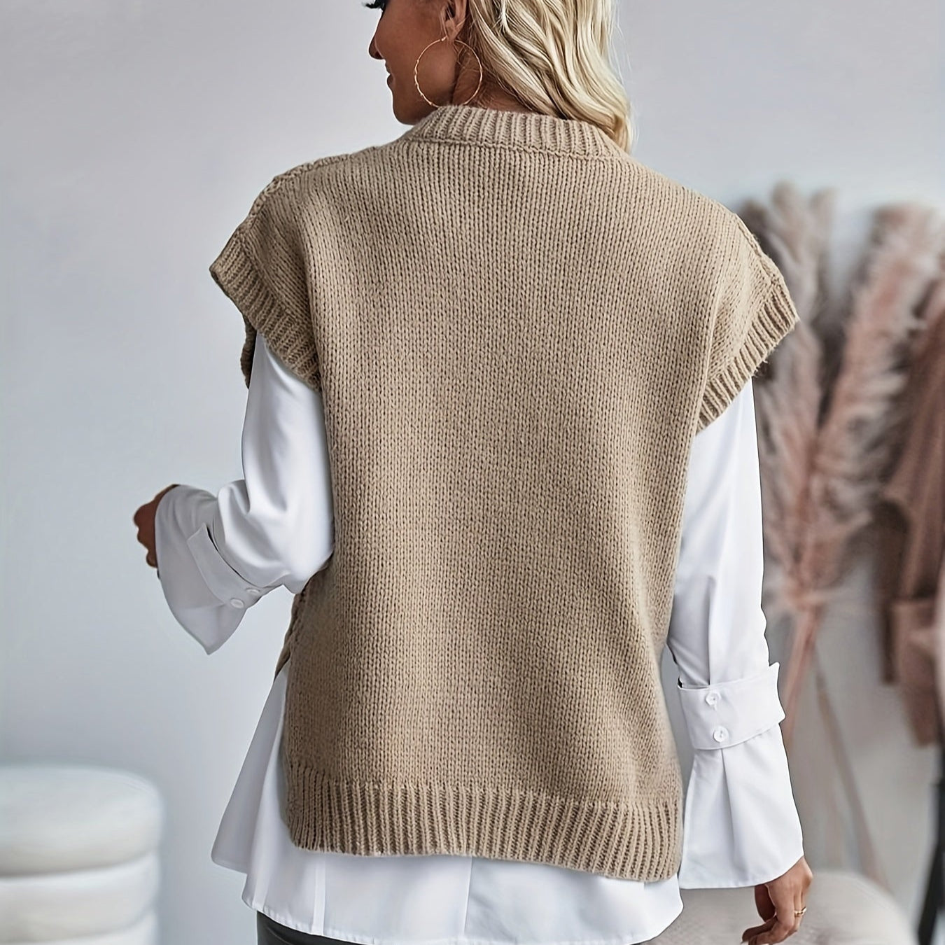 Blijf warm en stijlvol met deze gebreide mouwloze trui, ontworpen om gemakkelijk in laagjes te dragen en moeiteloos te charmeren. De losse pasvorm zorgt voor maximaal comfort, terwijl het mouwloze ontwerp hem veelzijdig houdt voor verschillende looks. Of je hem nu over een shirt draagt of alleen, deze trui is een go-to keuze voor koelere dagen.