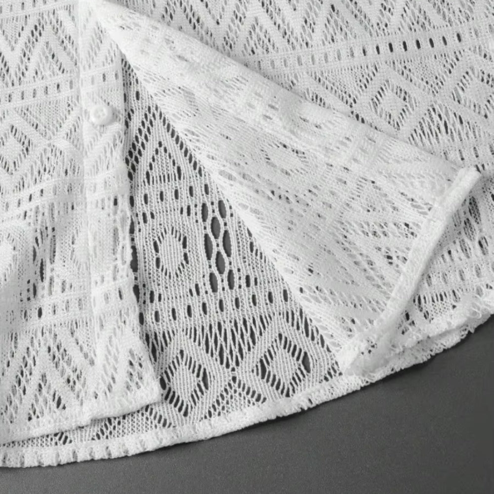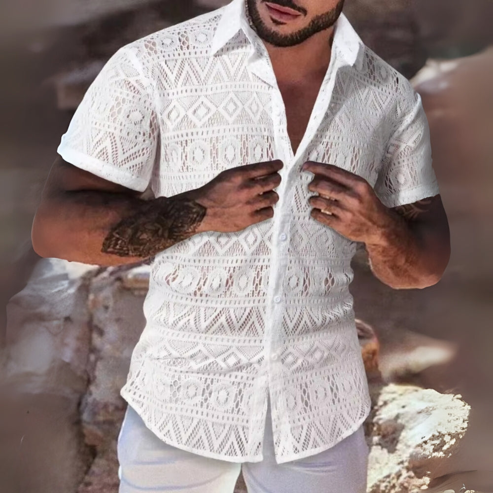 Henk - Transparant Gehaakt Shirt met Ethno-Patroon en Korte Mouwen