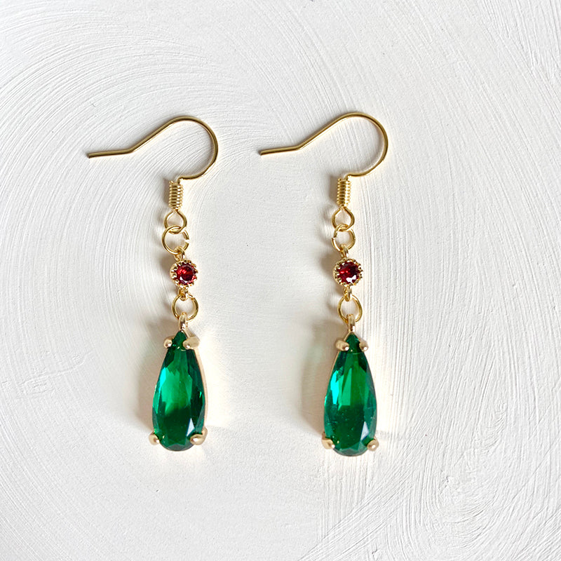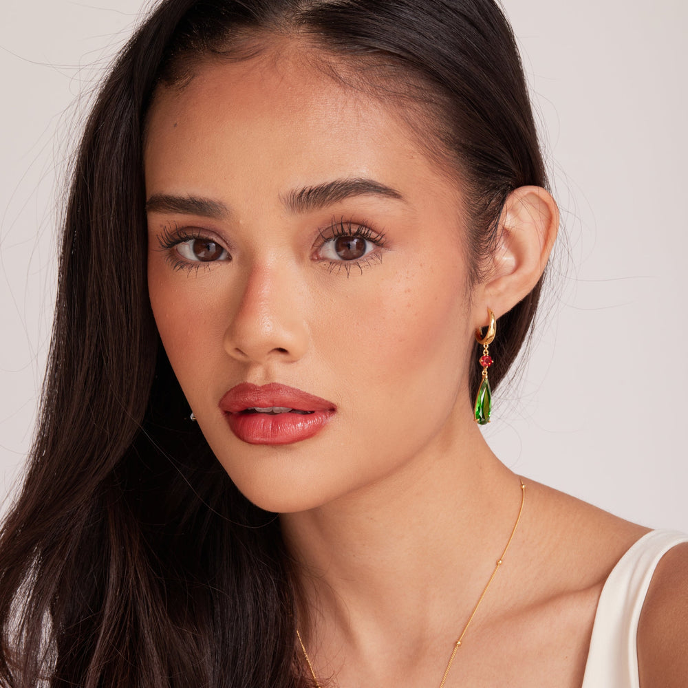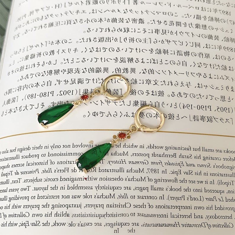 Deze oorbellen vangen de essentie van Howl's on-screen elegantie. De diepgroene zirkonia kristallen, gevormd tot dramatische traanvormige druppels, weerspiegelen de schoonheid van koninklijke juwelen. Hangend in een ring van goud voegt een scharlakenrode rondgeslepen kristal een vleugje drama toe. Deze juwelen hangen veilig aan knuffel-stijl hoepel oorbellen, waardoor zowel authenticiteit en comfort voor de gevoelige huid.